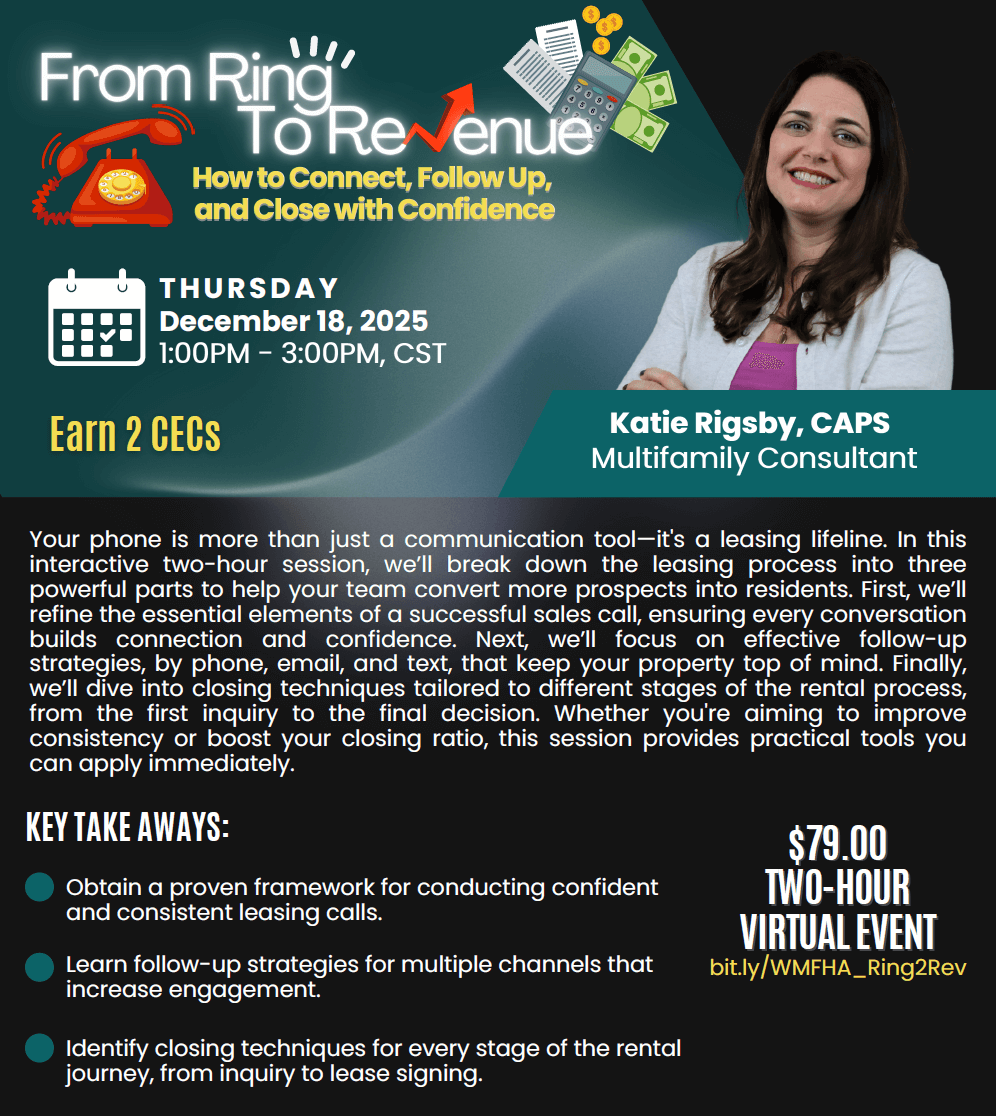 Your phone is more than just a communication tool—it's a leasing lifeline. In this interactive two-hour session, we’ll break down the leasing process into three powerful parts to help your team convert more prospects into residents. First, we’ll refine the essential elements of a successful sales call, ensuring every conversation builds connection and confidence. Next, we’ll focus on effective follow-up strategies, by phone, email, and text, that keep your property top of mind. Finally, we’ll dive into closing techniques tailored to different stages of the rental process, from the first inquiry to the final decision. Whether you're aiming to improve consistency or boost your closing ratio, this session provides practical tools you can apply immediately.