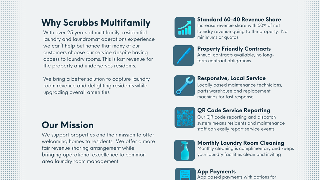 Why Scrubbs Multifamily Laundry Services? We bring fair revenue sharing with no minimums or quotas, property friendly annual contracts and added amenities such as laundry room and vent cleaning.
